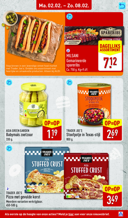 Deze tekst wordt automatisch gegenereerd, dus deze kan fouten bevatten.ie 7) Ki A ( (SPARERIBS 4 TT END N Ri ER | | / ER OÖ {wm = SI00FPONE IN TEKASSSTIJE ASIA ee EL = — NAN CHILIBONEN = METJACHTWORST | a) / Es ASIA GREEN GARDEN TRADER JOE'S Babymaïs zoetzuur / Stoofpotje in Texas- zu )07 [ 330 9 ‚800 & HERVE | U OTSL LV PILIA | EEK LUL (TU Um UF R Em ve KLEE | | ©: A Br A0: Ar … TRADERJOES | Pizza met gevulde korst O/ … Meerdere varianten verkrijgbaar. T 0-500 9 Zie B TE ou des as 7 ar