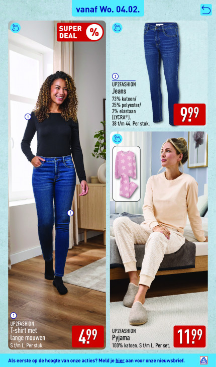 Deze tekst wordt automatisch gegenereerd, dus deze kan fouten bevatten.vanaf Wo. 04.02, 5 | © UP2FASHION Jeans 73% katoen/ 25% polyester/ 2% elastaan To (LYCRA®) 1 1 38 t/m 44. Per stuk. 1 p 3 Ge vs, —_ | Be Ei UP2FASHION ' b nm 7 Pyjama 1 71 Ca À 100% katoen. S En L. Per =