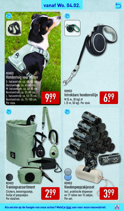 Deze tekst wordt automatisch gegenereerd, dus deze kan fouten bevatten.vanaf Wo. 04.02. à ze ur a © A @\ TC na © BEAN ru md ws +” 5 -. + vs) PN FA à DE = ROMEO 2 de 1 EN. Hondentuig voa en Fa 6 Va gi Mi $: halsomtrek: ca. 40 G Borstomtrek: ta.45-6 M: halsomtrek: ca. 48-6b cm. Borstomtrek: ca. 55-80 cm. ROMEO L: halsomtrek: ca. 53-75 cm. Intrekbare hondenrollijn Borstomtrek: ca. 75-100 cm. 9 M (5 m, 30 kg) of Per stuk. L (5 m, 50 kg). Per stuk. L i u Ex) SR wert x Ye tte Zr #4 2 ey: lt M: ri x ats zut En ss < hs rn a x CA Li a. nz GE a» Q © — 9 PA 74 A a … SN = ROMEO ROMEO NV Trainingsassortiment Hondenpoepzakjesse Clickers, beloningszakje, Incl. praktische dispenser fluitje of poepzakjes. en 17 rollen van 15 zakjes. Per stuk/set. Per set. Als eerste op de hoogte van onze acties? Meld je hier aan voor onze nieuwsbrief. A