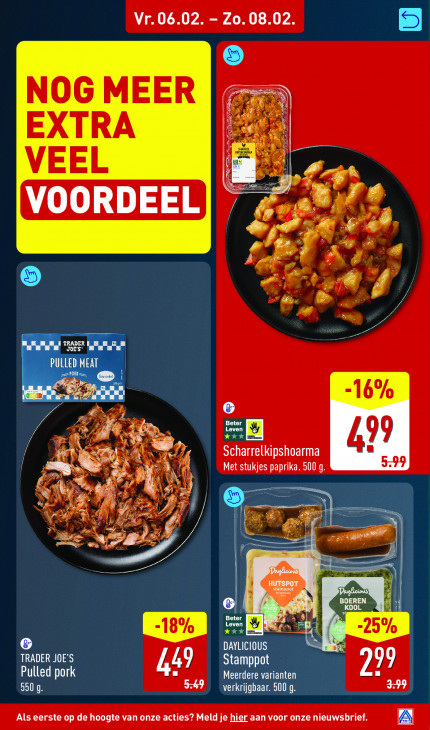 Deze tekst wordt automatisch gegenereerd, dus deze kan fouten bevatten.Vr.06.02. - Zo.08.02 NOG MEER FEN EXTRA VEEL f pr, Ld ur. & LE: Er VOORDEEL) # rf: dl es pd? de Ae Ki DE f. en P, u au Lun CAS PULLED MEAT | Pl @ E -16% Den 12 Leve Beter Le Ré 99 wi ij Scharrelkipshoarma ij Met stukjes paprika. 500 g 4 ep N a En mn le LÉ j A — HUTSPOT CE | À BOEREN 6 Beter Leven XX 25% © DAYLICIOUS 57 TRADER JOE'S Stamppot Pulled pork 449 Meerdere varianten 299 5509 verkrijgbaar. 500 q Als eerste op de hoogte van onze acties? Meld je hier aan voor onze nieuwsbrief.