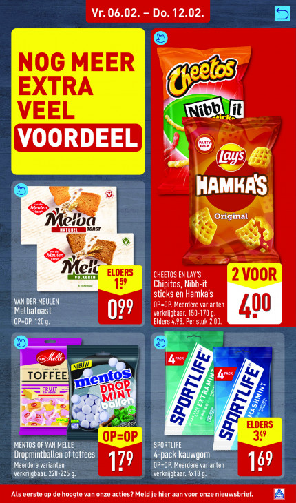 Deze tekst wordt automatisch gegenereerd, dus deze kan fouten bevatten.Vr. 06.02. - Do. 12.02. NOG MEER EXTRA VEEL ter VOORDEEL er en [73 ' HAMKAS WET Me IAST Original Y SL PA ELDERS CHEETOS EN LAY'S Voo 1% Chipitos, Nibb-ít sticks en Hamka's VAN DER MEULEN OP=OP. Meerdere varianten Melbatoast 99 verkrijgbaar. 150-170 g. 00 Elders 4.98. Per stuk 2.00. TSR 2 | ex sınDs 1820 rl de TOFFEE wos — FRUI Dé SMAKEN £ N y Mi N ELDERS OP oP 8 35 MENTOS OF VAN MELLE SPORTLIFE Dropmintballen oftoffees L-pack kauwgom Meerdere varianten 69 verkrijgbaar. 220-225 g. EL OP=OP. Meerdere varianten LT A en Als eerste op de hoogte van onze acties? Meld je hier aan voor onze nieuwsbrief.