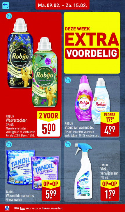 Deze tekst wordt automatisch gegenereerd, dus deze kan fouten bevatten.Ma. 09.02. - Zo. 15.02 DEZE WEEK DR ie ke EXTRA 4 9 ACT N \ Sal Robijn Beautiful Mystery END CA D 8 x NT DIE lig SE GEUR 5 Robin CU 1 cret 4 N | IR US ans, we } * Ç 5 1] Robijn Rob ROBIJN ELDERS V00 Wasverzachter ROBIN 1 729 OP=OP. Meerdere varianten 00 Vloeibaar wasmiddel verkrijgbaar. 38 wasbeurten OP=OP. Meerdere varianten 99 Per stuk 2.50. Elders 14.58 verkrijgbaar. 19-22 wasbeurten © 23 af ee L UN! IVER AN FRESH TANDIL R CAPS Te zin pINK LO! wascarsul St gs verWijderaar Ewe vS S ANDIL OP oP P=0P OP=OP TANDIL Wasmiddelcapsules 1599 Á mr 17 179 40 wasbeurten Klik hier voor onze actievoorwaarden