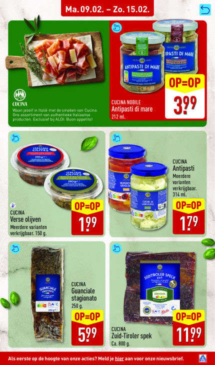 Deze tekst wordt automatisch gegenereerd, dus deze kan fouten bevatten.SE BT POT. = a 2 T \PASTI DI MARE nr 0 ANTIPAS CES MIT: ad CUCINA Waan jezelf in Italië met de smaken van Cucina. Ons assortiment van authentieke Italiaanse 399 producten. Exclusief bij ALDI. Buon appetito! HALA ENEN 3 © . CUCINA Antipasti 22. > @ Meerdere varianten GRIG ant dl verkrijgbaar. Wa 314 ml. CUORI DI LE @& W CUCINA mel Verse olijven 77 4 de 17 Meerdere varianten [ [ verkrijgbaar. 150 g. ® ® Oale 07 CUCINA ENIS CTP Guanciale ROL stagionato ad 250: 250 g. © Ean Zuid-Tiroler spek 77 Ses 599 U Ca. 800 9.
