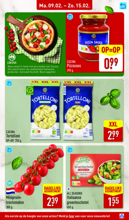 Deze tekst wordt automatisch gegenereerd, dus deze kan fouten bevatten.m 2 A # pe EN CUCINA A p\ZZA en 4% & x — CUCINA és NE Waan jezelf in Italië met de smaken van Cucina. 77 Ons assortiment van authentieke Italiaanse Ü producten. Exclusief bij ALDI. Buon appetito! ® ® Walle «ON ELLO, 4 A MH f CUCINA es ATC = Tortelloni 7509 75090 [> LL = OP=0P. 7509. Sr Za doors © Re Groenteschotel € v pee era « ©® 4509, ) Ö à = ik SEASONS Minipruim- Italiaanse trostomaten ne groenteschotel [sx nr - er 300 g. 450 g.