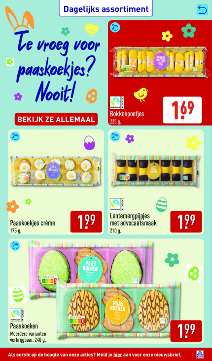 Deze tekst wordt automatisch gegenereerd, dus deze kan fouten bevatten.| Dagelijks assortiment | a; Te vroeg voor ETEN | 1 | LA Kr ad fil Pa askoekjes? & Nooit! m$ Bokkenpootjes VEEN Kn 5 9 & © VA vage | 6; 3 | A u 7 > MT A} Lentemergpijpjes met advocaatsmaak 175 9. Paaskoekjes crême Ni 2109. Ni eo D merg ge | ae nen N 8. FAIRTRADE N Paaskoeken 0 Meerdere varianten 5 = verkrijgbaar. 240 g. Als eerste op de hoogte van onze acties? Meld je hier aan voor onze nieuwsbrief.