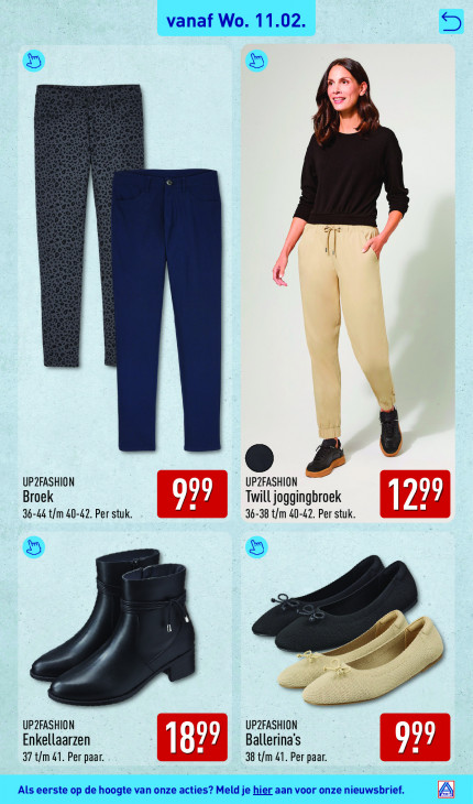 Deze tekst wordt automatisch gegenereerd, dus deze kan fouten bevatten.vanaf Wo. 11.02. D 8 zer] gip I | | „za UP2FASHION UP2FASHION Broek Twill joggingbroek 36-44 t/m 40-42. Per stuk. 36-38 t/m 40-42. Per stuk. 9 #4 UP2FASHION UP2FASHION Enkellaarzen Ballerina's 187 37 t/m 41. Per paar. 38 t/m 41. Per paar. Als eerste op de hoogte van onze acties? Meld je hier aan voor onze nieuwsbrief. A