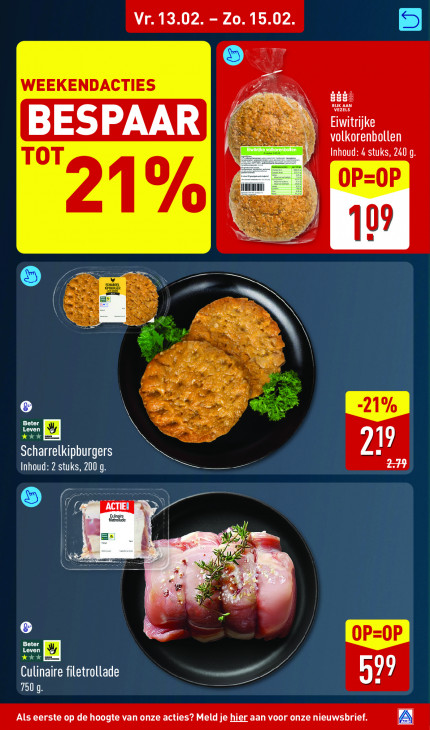 Deze tekst wordt automatisch gegenereerd, dus deze kan fouten bevatten.LKR VE 4 ERA WEEKENDACTIES Lt HA Ens SEE BESPAAR Eiwitrijke volkorenbollen 9 Inhoud: 4 stuks, 240 q Il I OP=OP "21 0 A 09 FE 6 2 Ei PR G R LOC LOT Le RS Scharrelkipburgers Inhoud: 2 stuks, 200 g. An EE Be ACTIEL a Ale A ge = = u LOC Lo 0 TU & Culinaire filetrollade A 57 7509. mn Als eerste op de hoogte van onze acties? Meld je hier aan voor onze nieuwsbrief.
