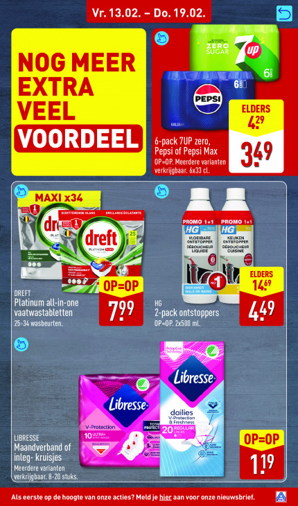 Deze tekst wordt automatisch gegenereerd, dus deze kan fouten bevatten.Vr. 13.02. - Do. 19.02. ra NOG MEER 3 fl EXTRA ELDERS VEEL LIFE) LP VOORDEEL 6-pack 7UP zero, Pepsi of Pepsi Max OP=OP. Meerdere varianten 34? verkrijgbaar. 6x33 cl. N M 7 AXI x34 CT nr Saa PROMO dr — HG Ll PROMO \ PLAT, OEIBARI dreft ONTSTOPPER omistoepen PLATINUM “RUE \ Fa A ELDERS ti 69 DREFT OP oP Platinum all-in-one HG vaatwastabletten LE Z-pack ontstoppers 449 25-34 wasbeurten. OP=0P. 2x500 ml. © 17 u - Le TA dailies V-Protection & Freshness QU 20 REGULAR IADS Wa SE Maandverband of Na = inleg- kruisjes OE }.) Meerdere varianten 19 verkrijgbaar. 8-20 stuks. Als eerste op de hoogte van onze acties? Meld je hier aan voor onze nieuwsbrief.