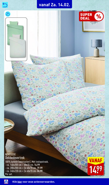Deze tekst wordt automatisch gegenereerd, dus deze kan fouten bevatten.SUPER DEAL 4. | & F | pn li 2 Lig Ze P- RES dd RE BP ar 4 Se 2 f Ve "4 MZ 3 6% Sun 4 : NOVITESSE Kl % 3 À Se Î 3 2 5 Dekbedovertrek % À 100% katoen (seersucker). Met instopstrook. SIE € - ca. 140x200 cm + 60x70 cm. 14.99 ML - ca. 200x200 cm + 2x 60x70em. 19.99 99 ANZ En A LL 7) 14 Per set. ;