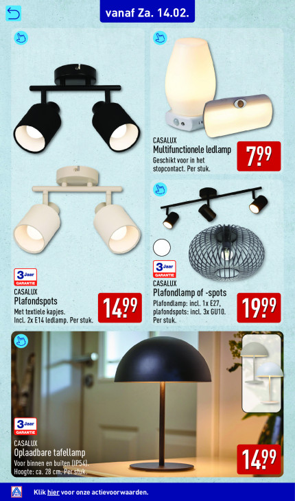 Deze tekst wordt automatisch gegenereerd, dus deze kan fouten bevatten.. CASALUX Multifunctionele ledlamp Geschikt voor in het El stopcontact. Per stuk. — Ad Hd AO Ÿ S N / / 7 À À | W Greer N N N N 29 ee 444 GG „ & aan = Zyaar 7 CASALUX CASALUX Plafondlamp of -spo ts Plafondspots L | Plafondlamp: incl. 1x E27, Met textiele kapjes. jr En plafondspots: incl. 3x GU10. 1999 Per stuk. he E14 ledlamp. Per stuk. r = "rd CASALUX Oplaadbare tafellamp ! 7 Voor binnen en buiten 14 um Hoogte: ca. 28 c Per-Sttk Klik hier voor onze actievoorwaar