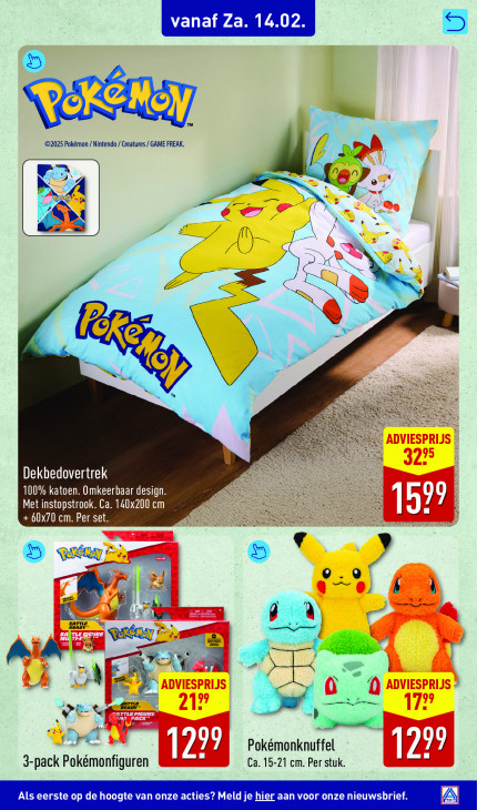 Deze tekst wordt automatisch gegenereerd, dus deze kan fouten bevatten.VEE We ©2025 Pokémon / Nintendo / Creatures / GAME FREAK. WA A an N vw À à © ee _— 7 € > «2 x À ” A ED à à ES Ib I > ed — RR a Dekbedovertrek 100% katoen. Omkeerbaar design A 7 Met instopstrook. Ca. 140x200 cm | ij + 60x70 cm. Per set. D KR y x {| je 0.0 2 Gl mart en, xt Us READY BATTLE. sh CREME se es D," “Sa” AA ee - To EG 2. | > A w me, ne «D x: te RE “ah Léo m 177 Pokémonknuffel lan [ a kk 3-pack ne Ca. 15-21 cm. Per stuk Als eerste op de hoogte van onze acti 2 Meld je hier aan voor onze nieuws