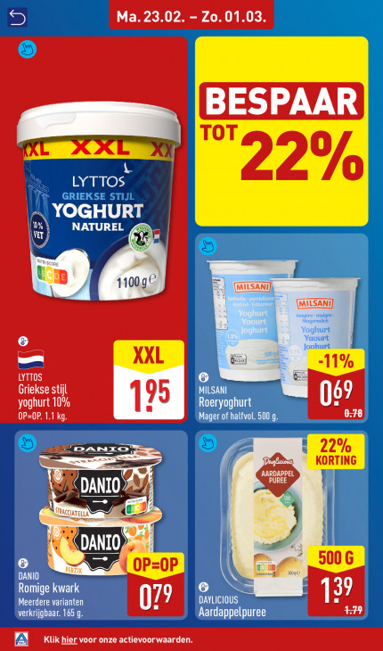 Deze tekst wordt automatisch gegenereerd, dus deze kan fouten bevatten.Ma. 23.02 CARE ESP AAR = LYTTOS TOT 2%, GRIEKSE STIJL YOGHURT 0% NATUREL x VUL scone EB 10040) urt 6) == = 1 1% LYTTOS Griekse stijl MILSANI 69 za CTA (Tad NN Mager of halfvol. 500 g. =, > — ES u 8 22% en KORTING DH) RACCIATEL à 500 G OP oP 5009 DANIO Romige kwark 79 6 Meerdere varianten DAYLICIOUS M FA verkrijgbaar. 165 9. Aardappelpuree Klik hier voor onze actievoorwaarden.
