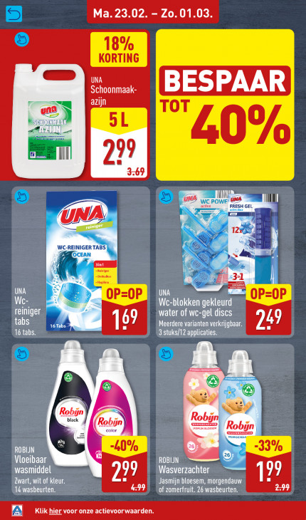 Deze tekst wordt automatisch gegenereerd, dus deze kan fouten bevatten.Ma. 23.02. - Zo. 01.03. 18% KORTING UNA Schoonmaak- ESP AAR azijn BL TOT 0% GE | | 99 I GE mn una zel GLE vs > dán M G N [| (AE E (en OP oP UNA OP=0 We-blokken gekleurd TE water of wc-gel discs tabs LE] 69 Meerdere varianten verkrijgbaar. pli 16 tabs. 3 stuks/12 applicaties. u Een Pe [Robijn black Robin Robÿn) \ color Robijn MORGENDA lc, 08 -4 0% ® 26 33% Vloeibaar U wasmiddel Wasverzachter rk, 99 Zwart, wit of kleur. 14 wasbeurten. Jasmijn bloesem, morgendauw of zomerfruit. 26 wasbeurten. A Klik hier voor onze actievoorwaarden.