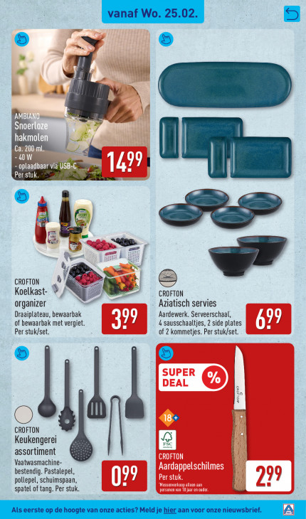 Deze tekst wordt automatisch gegenereerd, dus deze kan fouten bevatten.> ra W He Colle < = CI 77 pla BC ll TST 2 = Tun? wia “el ten EN vs k Gs) CROFTON GC & Koelkast Oe CROFTON organizer Aziatisch servies Aardewerk. Serveerschaal Draaiplateau, bewaarbak 377 Kl of bewaarbak met vergiet 4 sausschaaltjes, 2 side plates Per stuk/set of 2 kommetjes. Per stuk/set. © © a el © CROFTON Keukengerei FSC assortiment Vaatwasmachine: \ bestendig. Pastalepel pollepel, schuimspaan 02? spatel of tang. Per stuk _Alseersteop de hoogte van onze acties? Meld je hier aan voor onze nieuwsbrief. {A