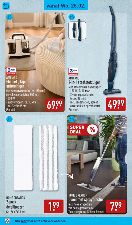 Deze tekst wordt automatisch gegenereerd, dus deze kan fouten bevatten.“ ‚JR _f À 3 &- # 1 Zaar sea Zyaar AMBIANO 2-in-1 steelstofzuiger Met afneembare handzuiger. - 120 W, 2200 mAh Il - 2 vermogensstanden EU (max. 38 min) - zuigvermogen: c - incl. laadstation, spleet - ca. 32x24x35 cm 11 - opzetstuk en opzetborstel TE Per stuk. ù 7 Fer stuk. SN Im %- DI 2 u =l Dani. n< HOME CREATION CAT UN Dweil met spray! 2-pack Incl. hoes en voorzien dweilhoezen 71 11 [ van geintegreerde tank. ] Ca. 2x 47x13 cm. LEGER 125 ue