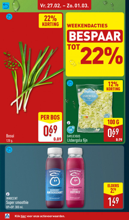Deze tekst wordt automatisch gegenereerd, dus deze kan fouten bevatten.@ à { Vr.27.02. - Zo.01.03 2 22% KORTING WEEKENDACTIES 2 eG = u EAS TOT 20/. 12% 5 KORTING PER BOS 100 6 ie ORS 69 Bosui 069 EAR VN bergsla fijn | f nnocens adder EFENCE UT DANT INNOCENT Menever add zoge Super smoothie _ 14) VEN A Klik hier voor onze actievoorwaarden