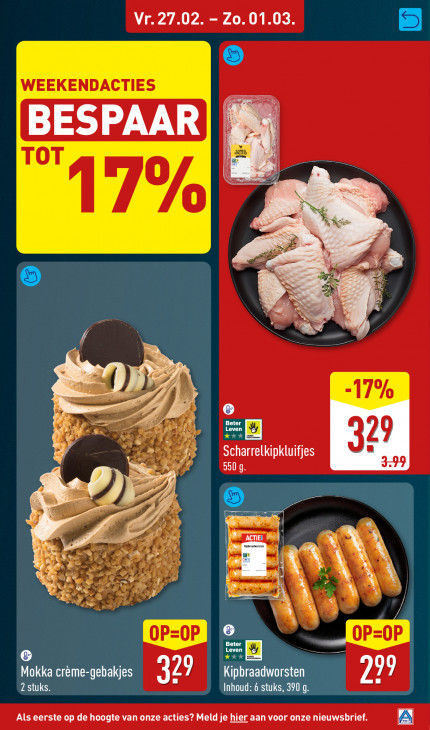 Deze tekst wordt automatisch gegenereerd, dus deze kan fouten bevatten.Vr. 27.02. - Zo. 01.03 WEEKENDACTIES RE) ij pn SE TOT To, = BE 4 -1 7% Beter Cr KXXX Leven 1 29 Fi Scharrelkipkluifjes FA 5509 D 4 ‘ m = me % 7 ete Aa À OP OP OP oP Bet kota Mokka crème-gebakjes Kipbraadworsten 99 2 stuks. A Inhoud: 6 stuks, 390 q Als eerste op de hoogte van onze acties? Meld je hier aan voor onze nieuwsbrief A