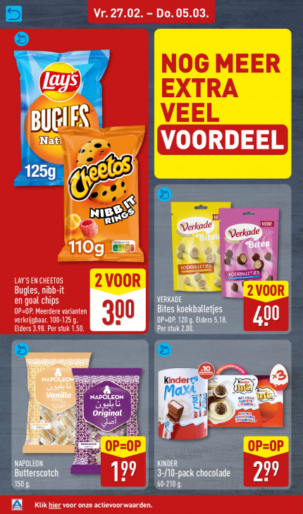 Deze tekst wordt automatisch gegenereerd, dus deze kan fouten bevatten.Vr. 27.02. - Do. 05.03. f NOG MEER EXTRA VEEL Al Pl \ D Natı VOORDEEL | 125g NIB ul: Verkade Verkade >>> — 110g en > LAY'S EN CHEETOS CES Voo Bugles, nibb-it 2 VOOR en goal chips VERKADE OP=OP. Meerdere varianten Bites koekballetjes verkrijgbaar. 100-125 q. 00 OP=OP. 120 g. Elders 5.18. Elders 3.98. Per stuk 1.50. Per stuk 2.00. 400 D, nd eo NAPOLEON MET COOLE GADGETS: [®) 5 U FIGUREN OET r 4) {FIGURINES 1] E à | AR ns OP oP OP OP NAPOLEON TT EAU TAN 99 3-/10-pack chocola ne 99 150 g. SAE Klik hier voor onze actievoorwaarden.