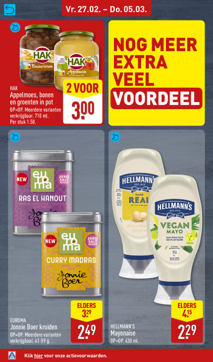 Deze tekst wordt automatisch gegenereerd, dus deze kan fouten bevatten.Vr. 27.02. - Do. 05.03. = NOG MEER gg. HAKS TUN PUS EXTRA af HAK VEEL 2 VOOR Appelmoes, bonen en groenten in pot VOORDEEL OP=0P. Meerdere varianten 00 verkrijgbaar. 710 ml. Per stuk 1.50. | I u | ZER | NEW ADDEI SAL Sr SAME RAS EL HANOUT REAI eeringe ets ED ee TS 1 4 EGAN FRS av MAYO ZER SAME GREATTASTE NEW ECR 100% PLANT BASED Ì ( am, DIPS = L DS où EUROMA ee Don OCT OP=OP. Meerdere varianten 24 Mayonaise 229 el ad verkrijgbaar. 41-59 g. EN EEE Klik hier voor onze actievoorwaarden.