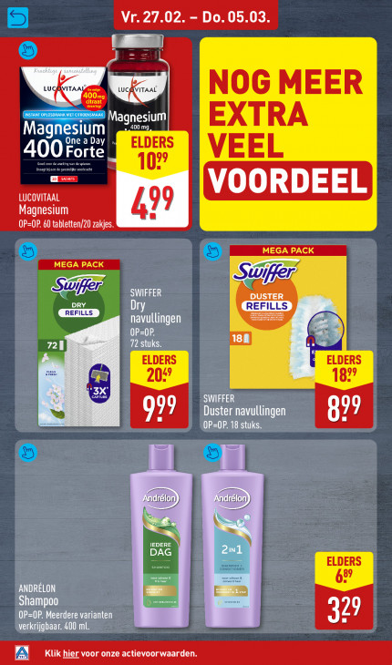 Deze tekst wordt automatisch gegenereerd, dus deze kan fouten bevatten.Vr. 27.02. - Do. 05.03. SIE NOG MEER 4 Magnesium EXTRA Magnesium 400 mg One a Day ELDERS VEEL 400 es 10? VOORDEEL LUCOVITAAL Magnesium 19 OP=0P. 60 tabletten/20 zakjes. MEGA PACK MEGA PACK Sy, Si WEI; SWIFFER DUSTER nr Dr navullingen El 72] SC 184 5 ELDERS EERS iens 187 Ga 3X CAPTURE SWIFFER LE Duster navullingen 899 OP=OP. 18 stuks. Fi Bi = Al rats BE Shampoo ANDRELON Shampoo OP=OP. Meerdere varianten Ih] verkrijgbaar. 400 ml. Klik hier voor onze actievoorwaarden.