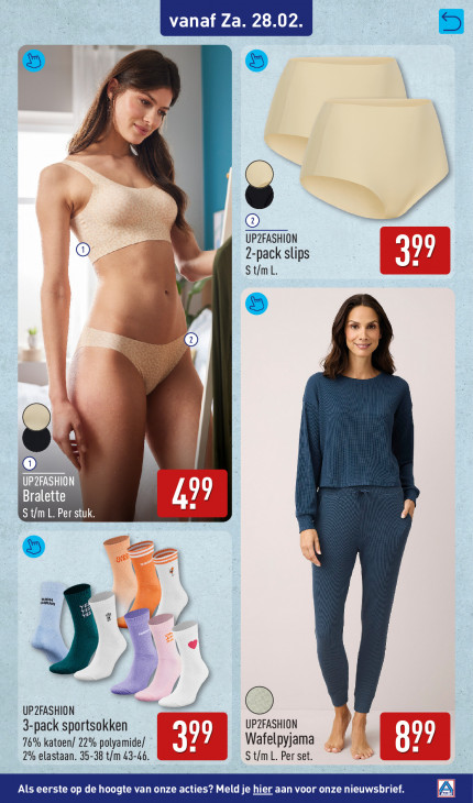 Deze tekst wordt automatisch gegenereerd, dus deze kan fouten bevatten.FA x © UP2FASHION 2-pack slips 399 St/mL. © e Bralette ud S t/m L. Per stuk. ORN BON, UP2FASHION © 3-pack sportsokken UP2FASHION } f 76% katoen/ 22% polyamide/ Wafelpyjama 399 St/m L. Per set. 3 2% elastaan. 35-38 t/m ni Als eerste op de hoogte van onze acti 2 Meld je hier aan voor onze nieuws