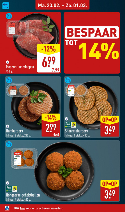 Deze tekst wordt automatisch gegenereerd, dus deze kan fouten bevatten.Ma. 23.02. - Zo. 01.03 ee BESPAAR -12% TOT ANA ® 99 Magere runderlappen An 7 Al AN ë 7 Beter OP Leven kkX eN % Shoarmaburgers 14) E Inhoud: 2 stuks, 200 g Inhoud: 4 stuks, 400 g. iu rees Li > LA Beter Leven FP LORS 14) Hongaarse gehaktballen Inhoud: 4 stuks, 400 q nr Klik hier voor onze actievoorwaarden